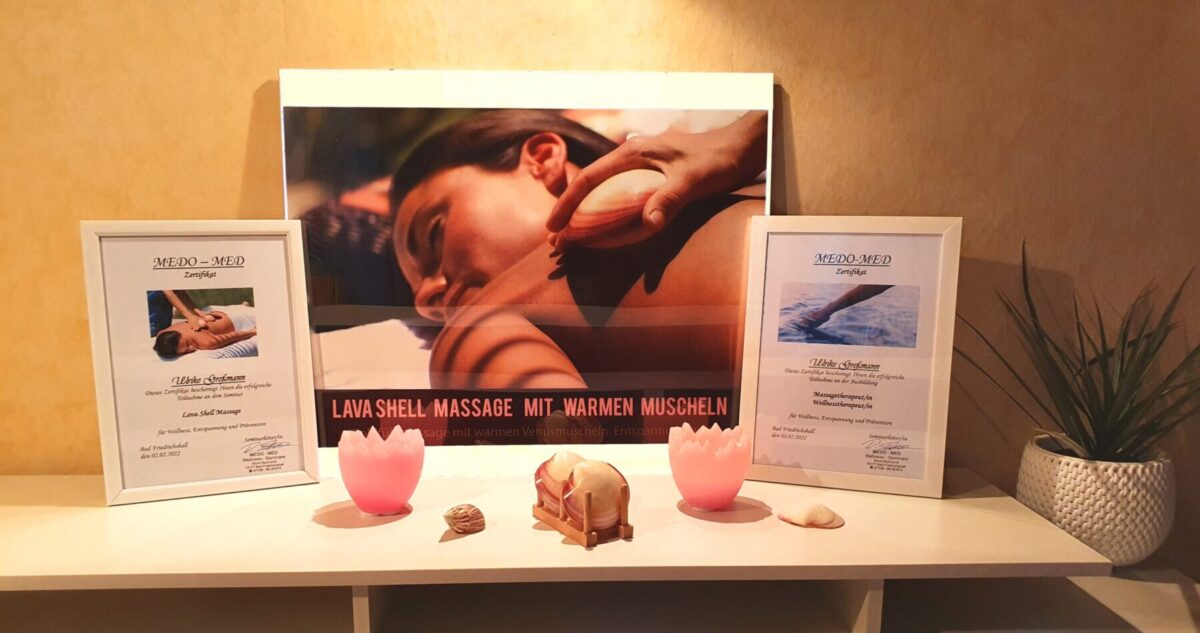 Ein ganz besonderes Wellnesserlebnis ist die Massage mit der natürlichen und angenehm warmen „Lava-Shell“-Venusmuschel. Jede Lava-Shell ist eine echte, handverlesene Venusmuschel aus dem Südpazifik, die aus den Schalen der verzehrten Muscheln aufbereitet wird. Lava Shells bestehen aus natürlichem Kalk. Das Lava-Gel, das für die Wärme während der Massage verwendet wird, besteht aus natürlichen Mineralien mit getrocknetem Seetang und Algen und ist biologisch abbaubar.